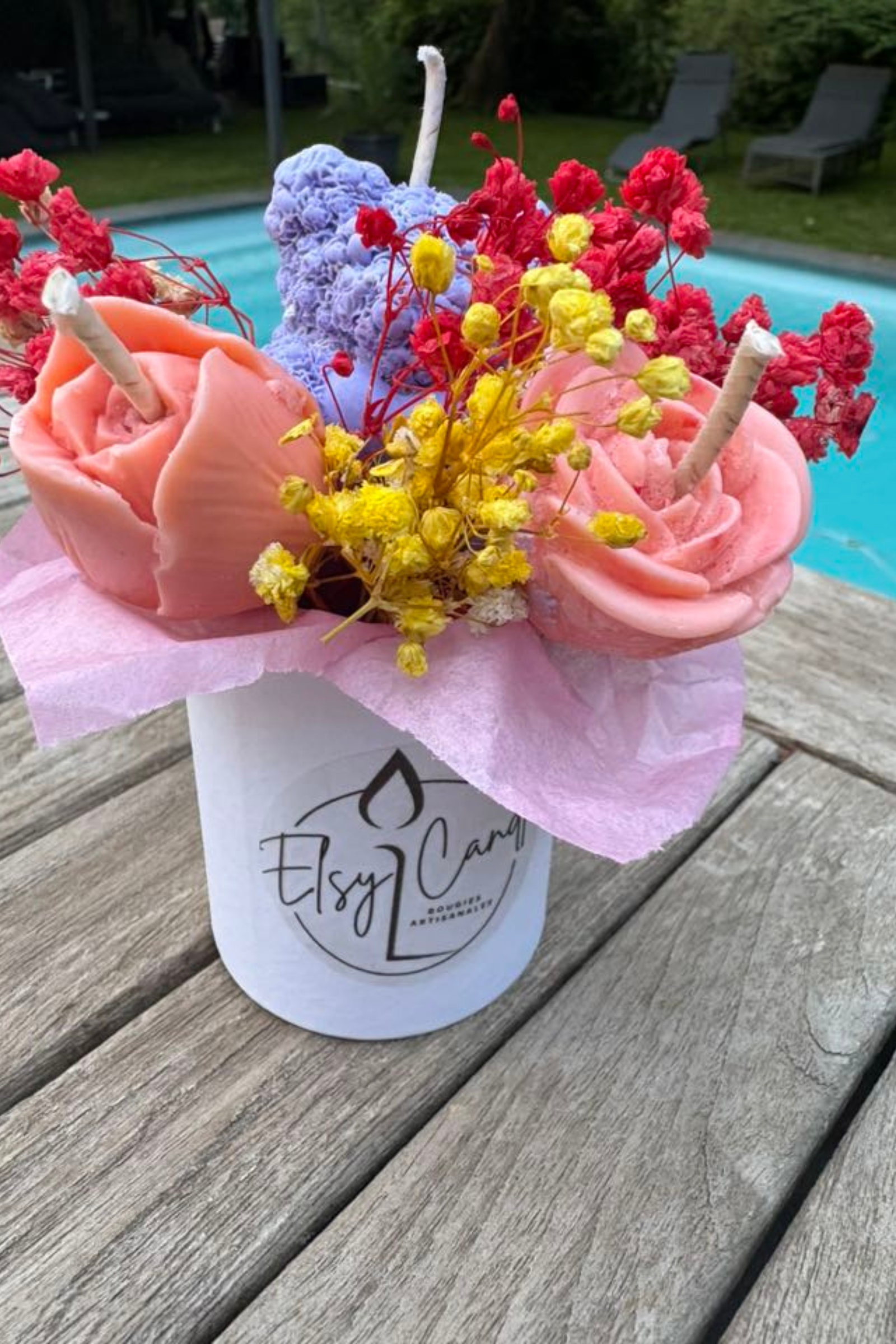 Une harmonie délicate entre fleurs éternelles et bougies artisanales aux senteurs envoûtantes. Un moment de douceur, 100 % fait main avec amour. Ce montage est parfait pour vos évènements familliaux